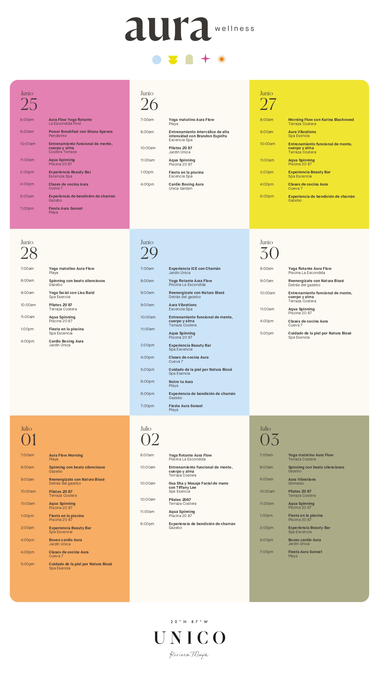 UNICO 20°87° Hotel Riviera Maya estrena su primer evento de salud y bienestar de varios días. Aura Wellness expondrá una experiencia inmersiva única en su tipo en torno a los cinco componentes clave: bienestar, nutrición, salud mental, belleza y condición física.