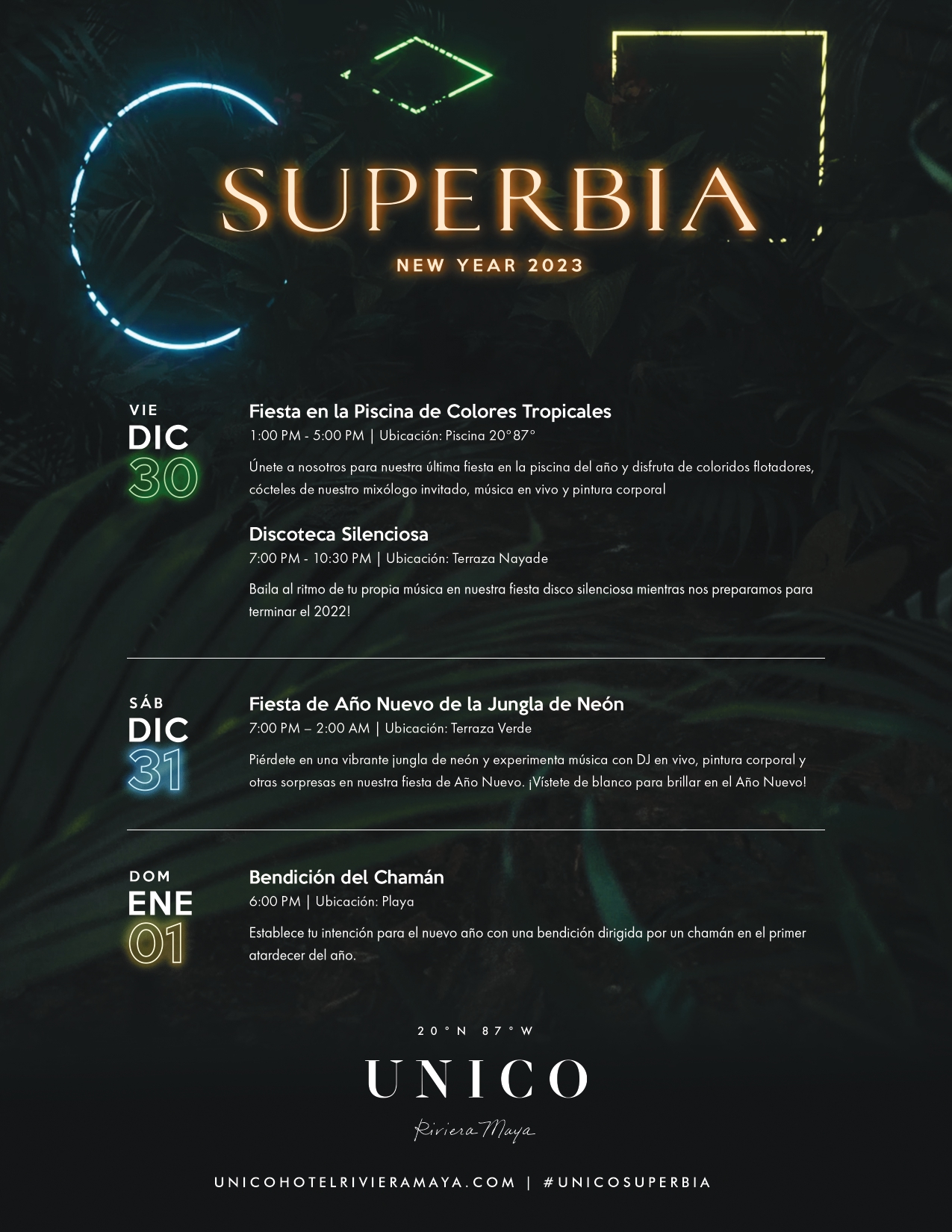 Año Nuevo Superbia 2023 está de vuelta en Unico 20°87°! Sumérgete en una jungla eufórica y vibrante durante tres días de festividades y veladas de neón brillante. Despídete del 2022 bailando en nuestra resplandeciente fiesta de fin de año. Desde coloridas fiestas en la piscina y arte corporal llamativo hasta discotecas silenciosas y una bendición tradicional dirigida por un chamán, comienza tu Año Nuevo con un resplandor.