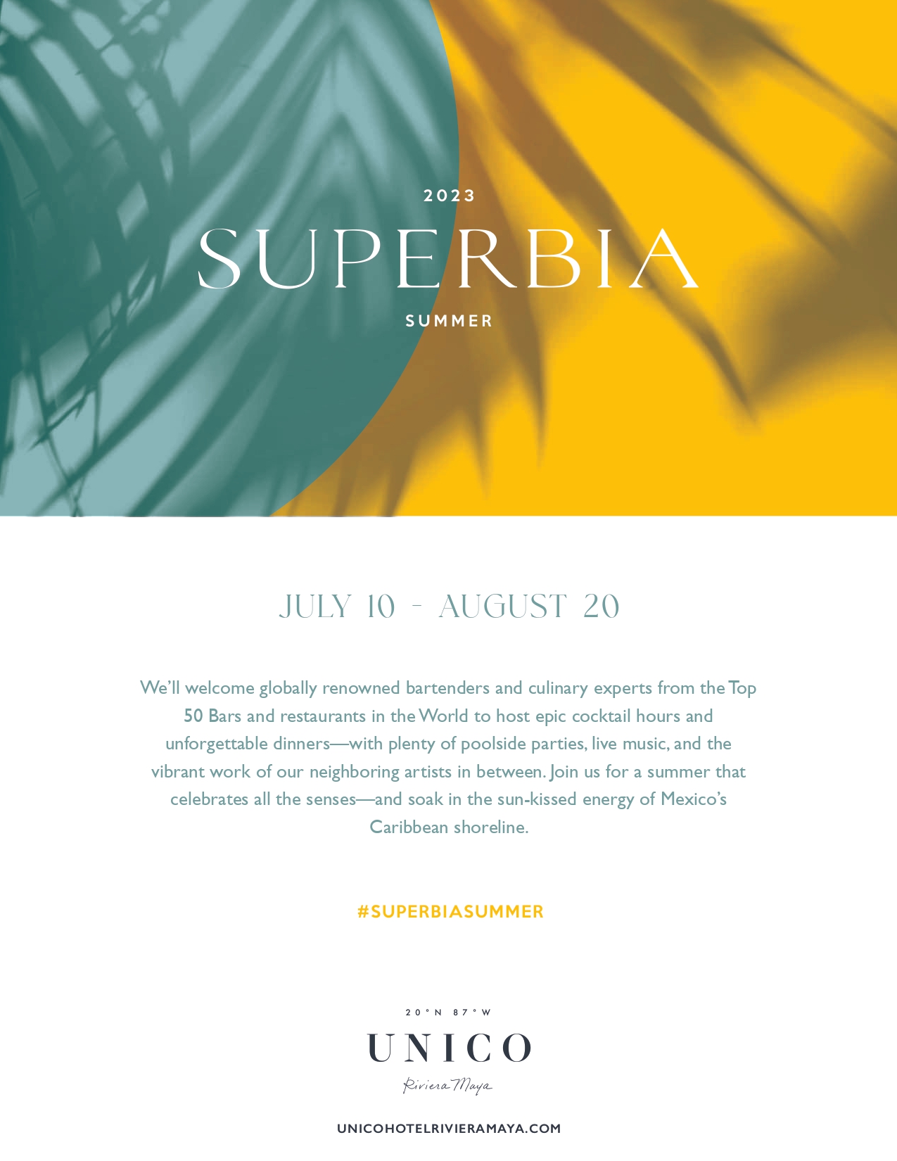 Temos o prazer de anunciar um evento extraordinário que acontecerá no UNICO 20°87° Hotel Riviera Maya. Apresentando o Superbia Summer 2023: uma celebração da excelência culinária, mixologia e arte. Este evento único reunirá os melhores mixologistas globais e especialistas culinários de alguns dos restaurantes mais prestigiados do mundo, incluindo mixologistas dos 50 melhores bares da América do Norte. Cada experiência promete transportá-lo para novos patamares gastronómicos.